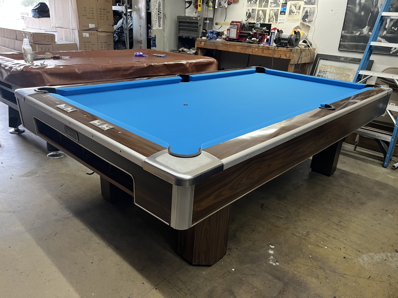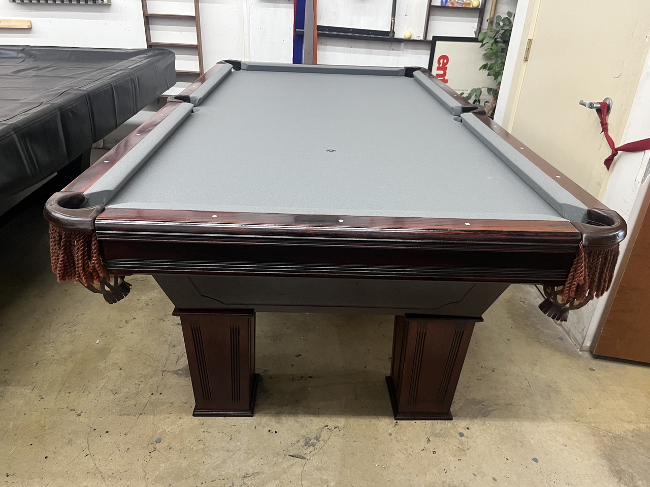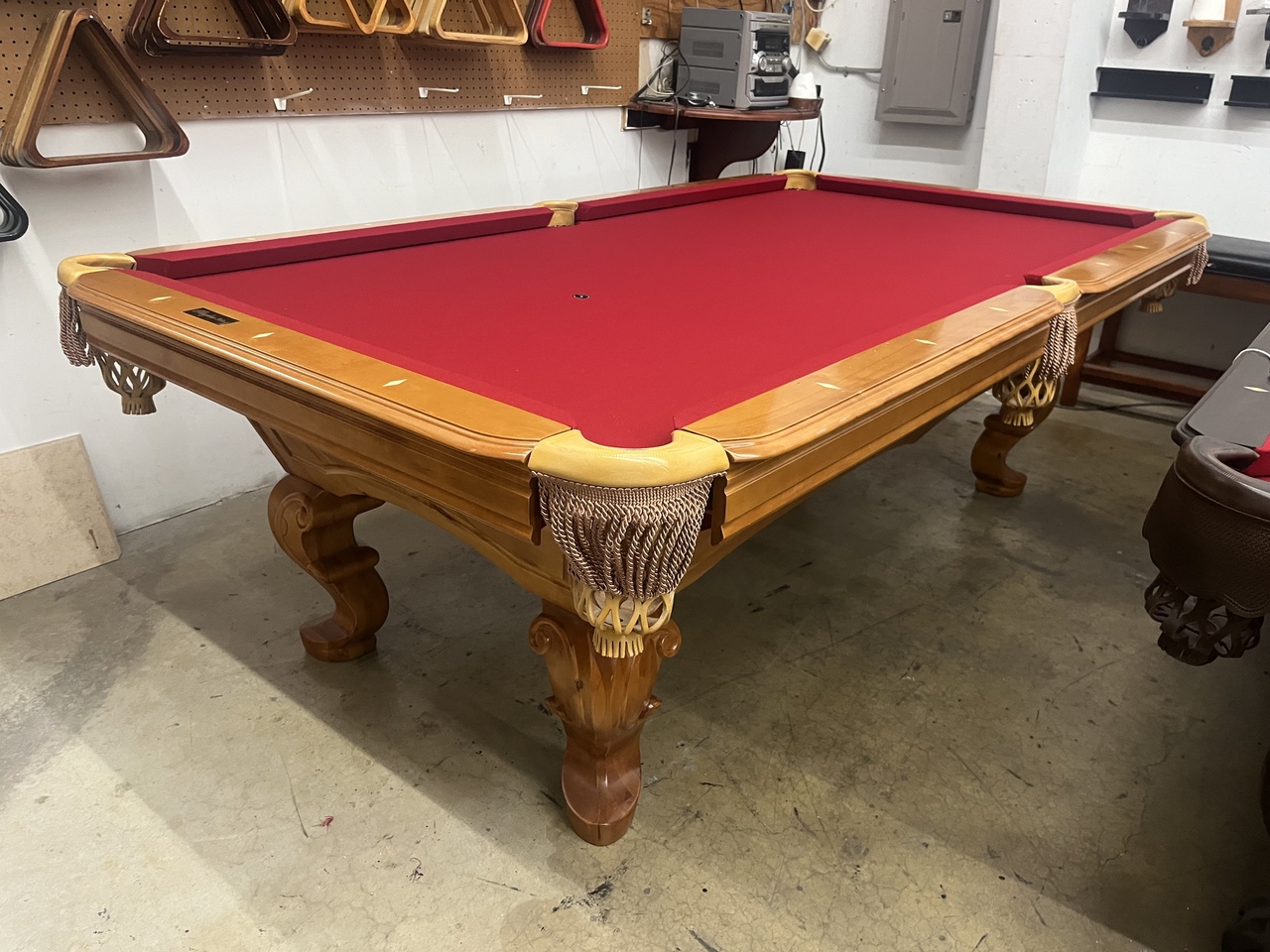 All of our pre-owned pool tables go through an intensive inspection process when they first arrive. We start from the leg casters, to the legs, frame, slate, rails, pockets, cushions and felt. The pool tables are cleaned up, some are sanded and re-stained, frame parts are repaired or replaced if need be. The slates are inspected for any cracks or breaks and are repaired according to their condition. Cushions are always tested for true accurate bounce and are replaced if needed. Leather or plastic pockets are also repaired or re-placed depending on their condition. The cloth is replaced on about 90% of the tables that come through our shop as well. All of our Used pool tables also include: Local delivery ( Millage fees apply on out of town deliveries), Professional Installation (stairs fees apply if any), All Accessories (Balls, Cues, Felt Brush, Matching Color Chalk, Bridge and Wall Mount Rack), and New Cloth by Championship.