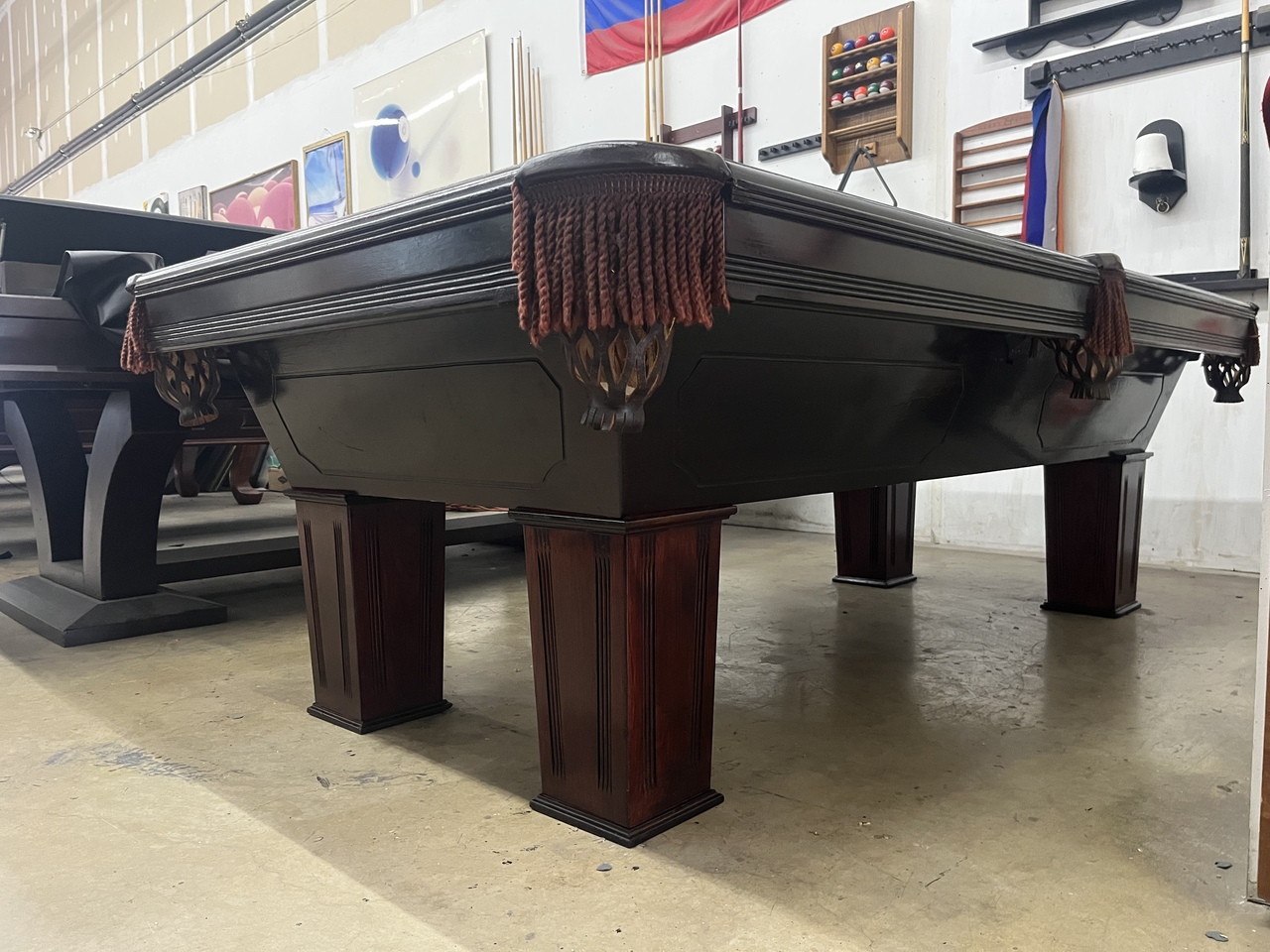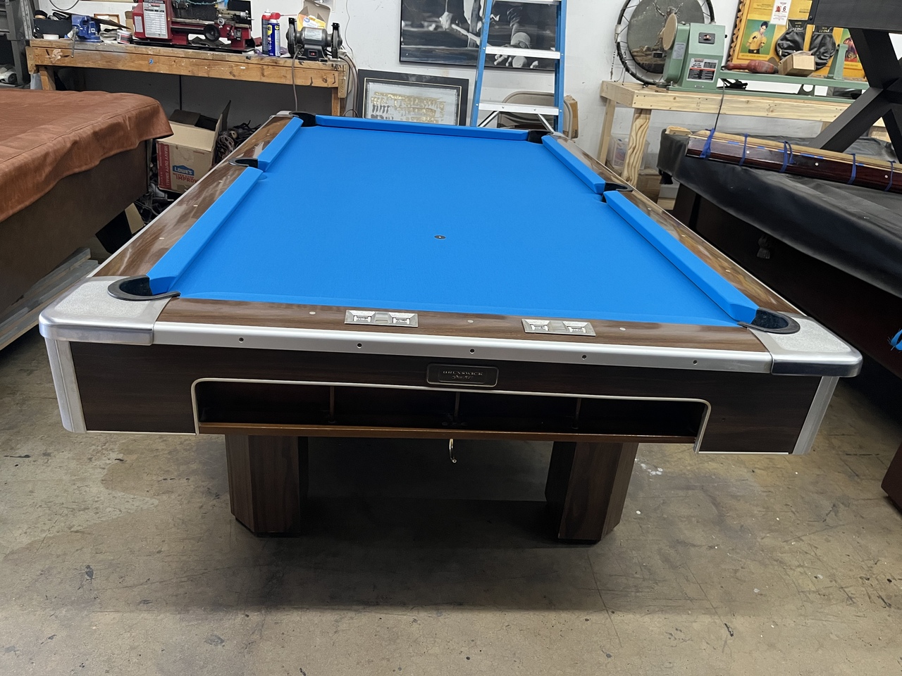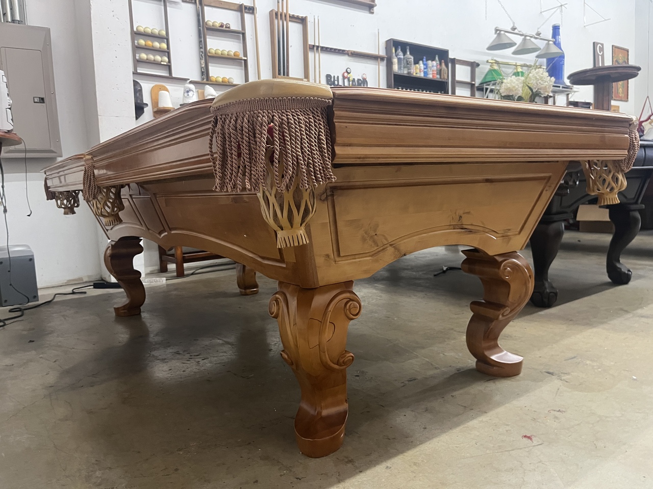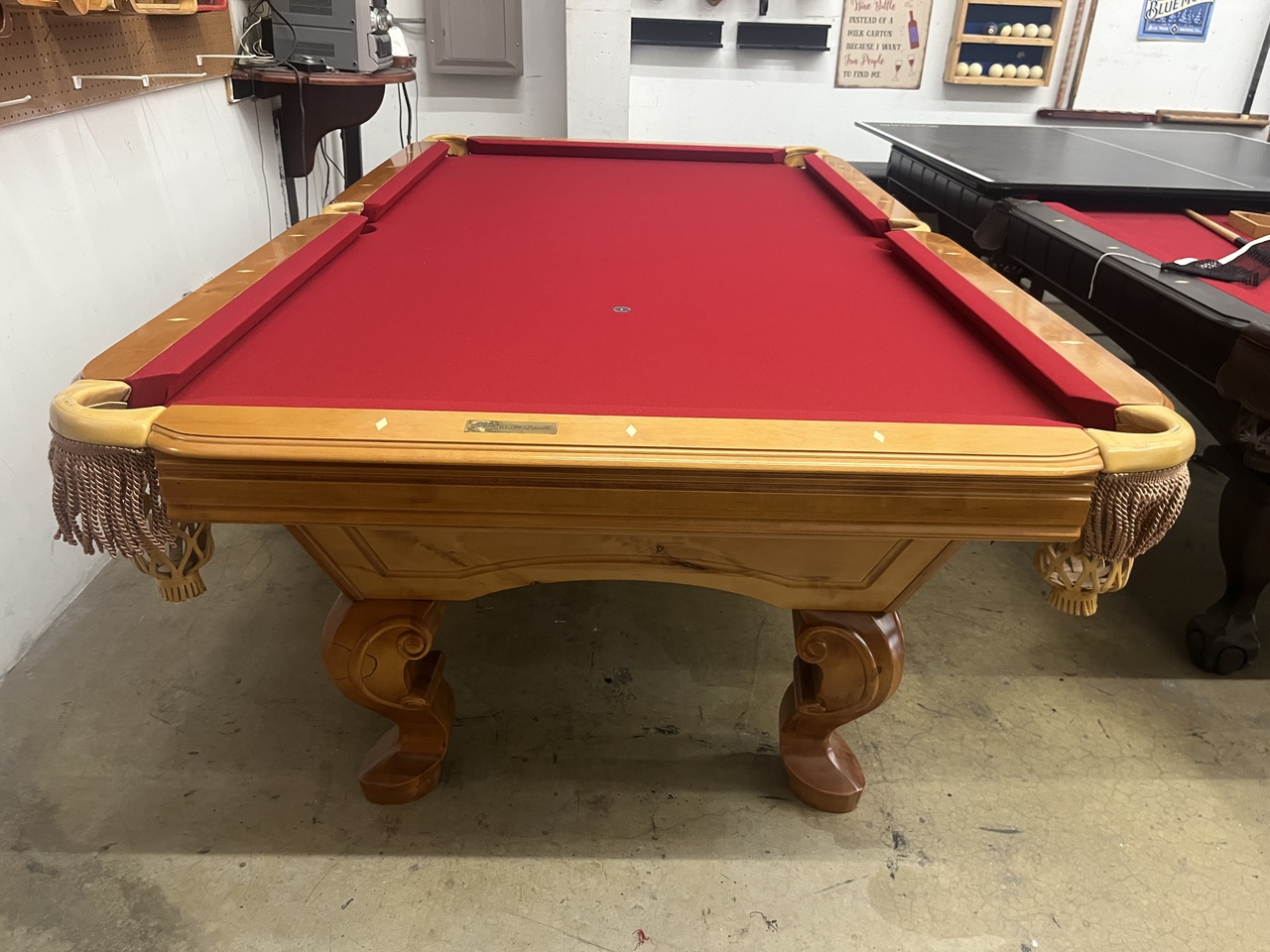 All of our pre-owned pool tables go through an intensive inspection process when they first arrive. We start from the leg casters, to the legs, frame, slate, rails, pockets, cushions and felt. The pool tables are cleaned up, some are sanded and re-stained, frame parts are repaired or replaced if need be. The slates are inspected for any cracks or breaks and are repaired according to their condition. Cushions are always tested for true accurate bounce and are replaced if needed. Leather or plastic pockets are also repaired or re-placed depending on their condition. The cloth is replaced on about 90% of the tables that come through our shop as well. All of our Used pool tables also include: Local delivery ( Millage fees apply on out of town deliveries), Professional Installation (stairs fees apply if any), All Accessories (Balls, Cues, Felt Brush, Matching Color Chalk, Bridge and Wall Mount Rack), and New Cloth by Championship.