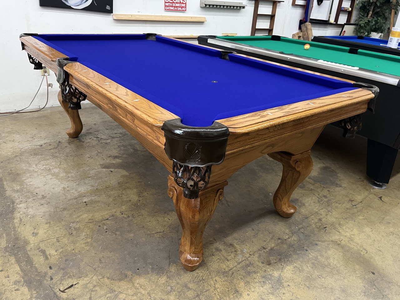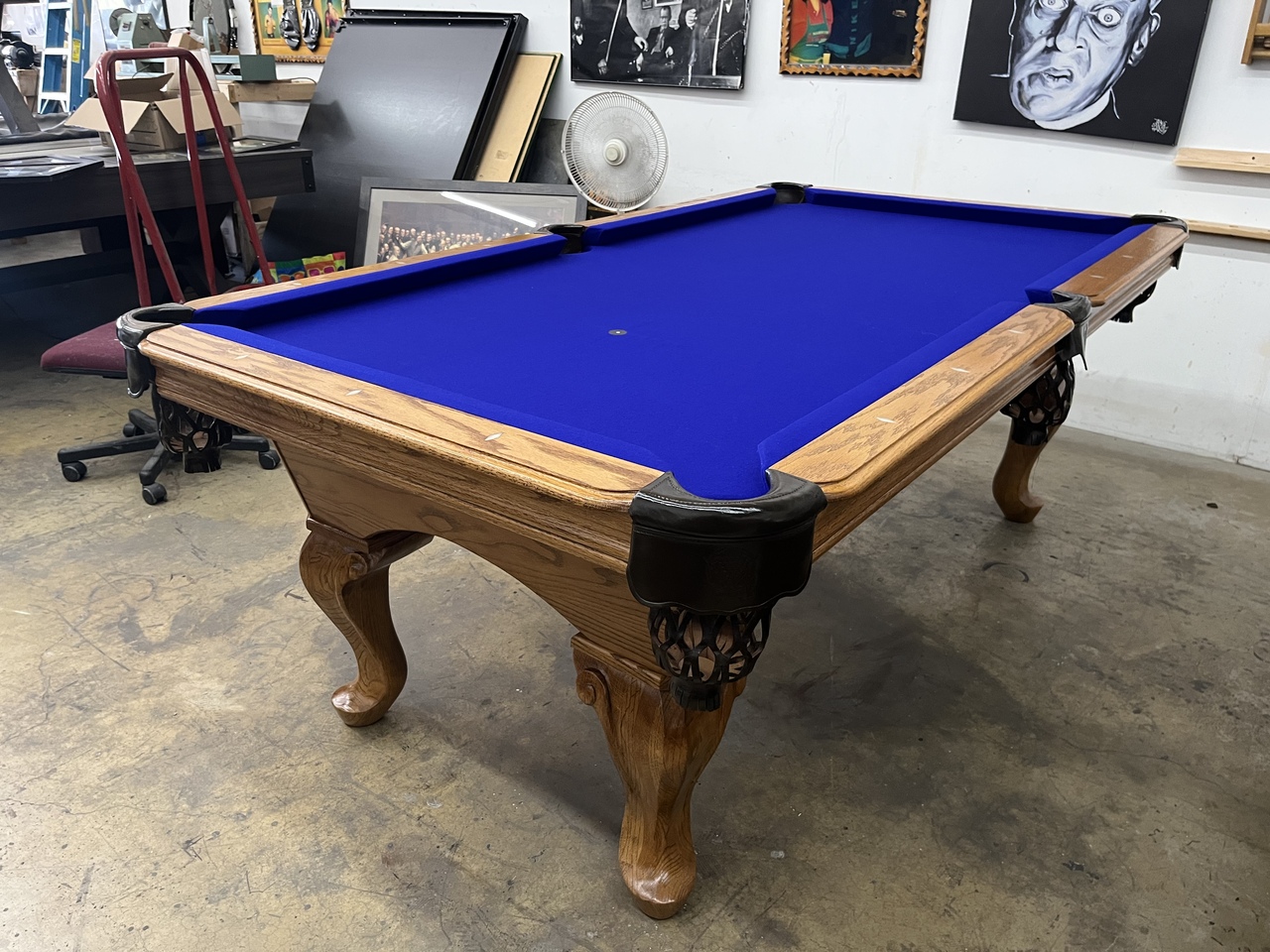All of our pre-owned pool tables go through an intensive inspection process when they first arrive. We start from the leg casters, to the legs, frame, slate, rails, pockets, cushions and felt. The pool tables are cleaned up, some are sanded and re-stained, frame parts are repaired or replaced if need be. The slates are inspected for any cracks or breaks and are repaired according to their condition. Cushions are always tested for true accurate bounce and are replaced if needed. Leather or plastic pockets are also repaired or re-placed depending on their condition. The cloth is replaced on about 90% of the tables that come through our shop as well. All of our Used pool tables also include: Local delivery ( Millage fees apply on out of town deliveries), Professional Installation (stairs fees apply if any), All Accessories (Balls, Cues, Felt Brush, Matching Color Chalk, Bridge and Wall Mount Rack), and New Cloth by Championship.