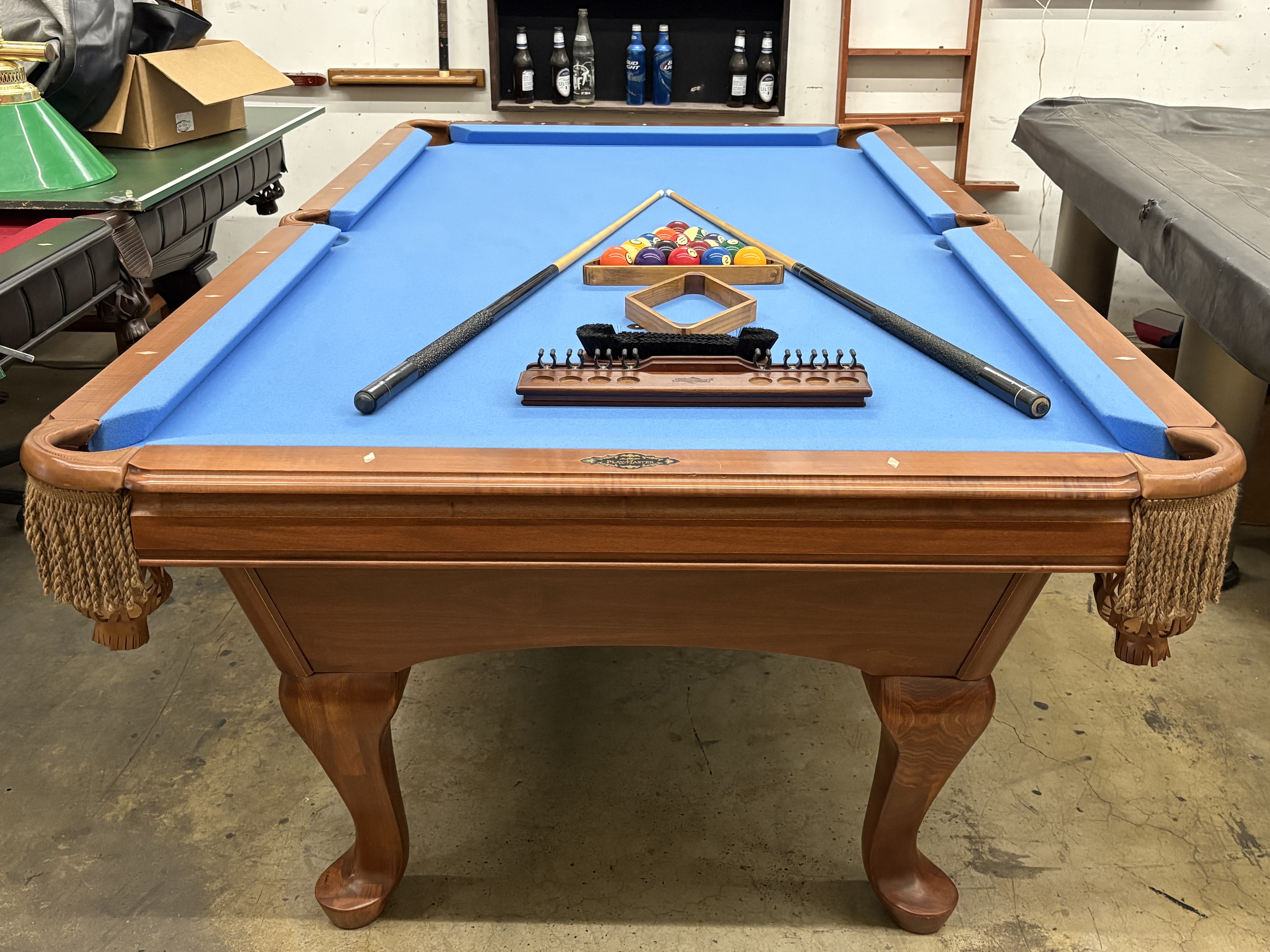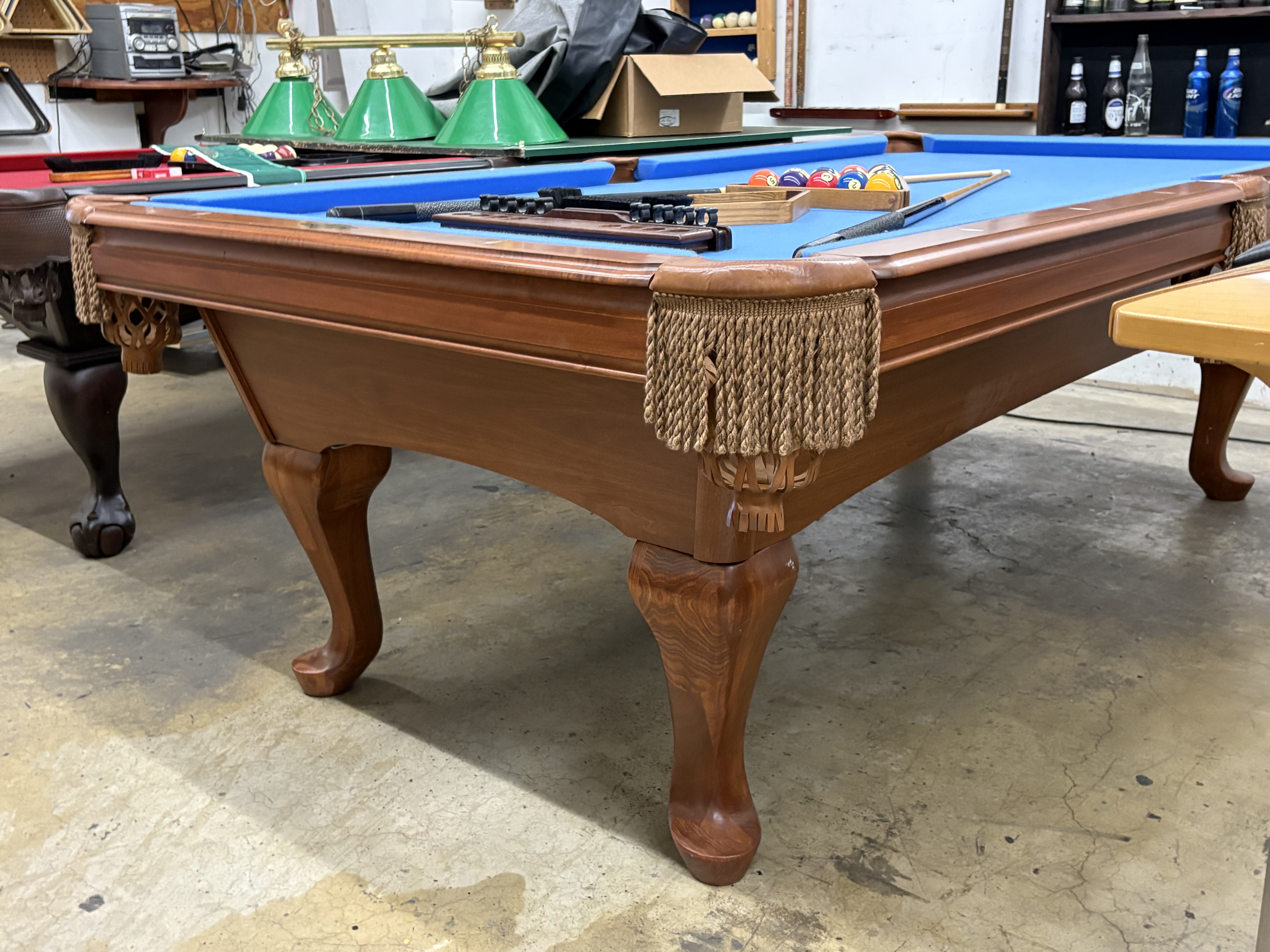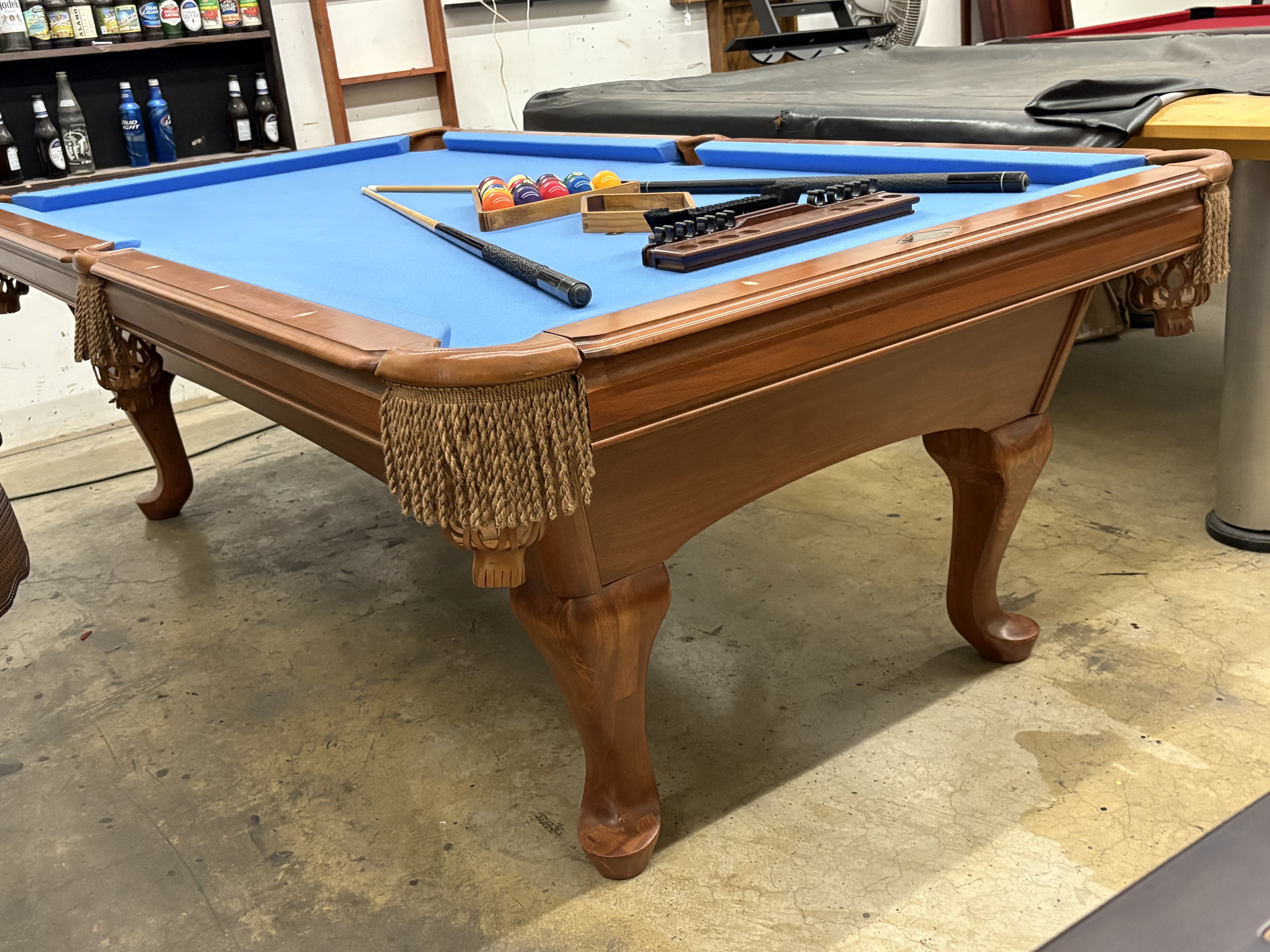 All of our pre-owned pool tables go through an intensive inspection process when they first arrive. We start from the leg casters, to the legs, frame, slate, rails, pockets, cushions and felt. The pool tables are cleaned up, some are sanded and re-stained, frame parts are repaired or replaced if need be. The slates are inspected for any cracks or breaks and are repaired according to their condition. Cushions are always tested for true accurate bounce and are replaced if needed. Leather or plastic pockets are also repaired or re-placed depending on their condition. The cloth is replaced on about 80% of the tables that come though our shop as well. All of our Used pool tables also include: Local delivery ( Millage fees apply on out of town deliveries), Professional Installation (stairs fees apply if any), All Accessories (Balls, Cues, Felt Brush, Matching Color Chalk, Bridge and Wall Mount Rack), and New Cloth by Championship.