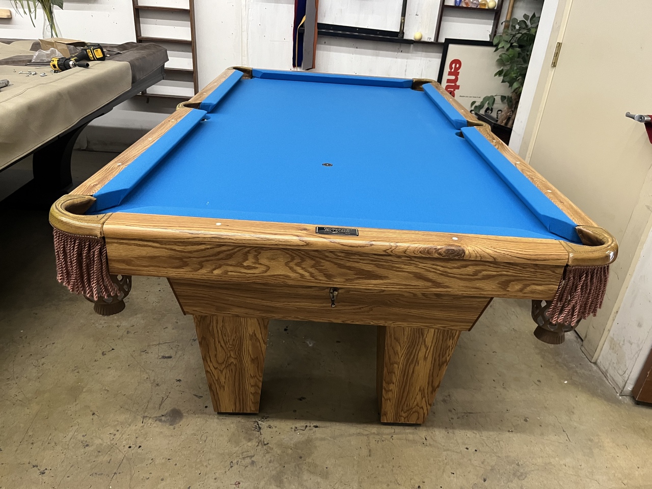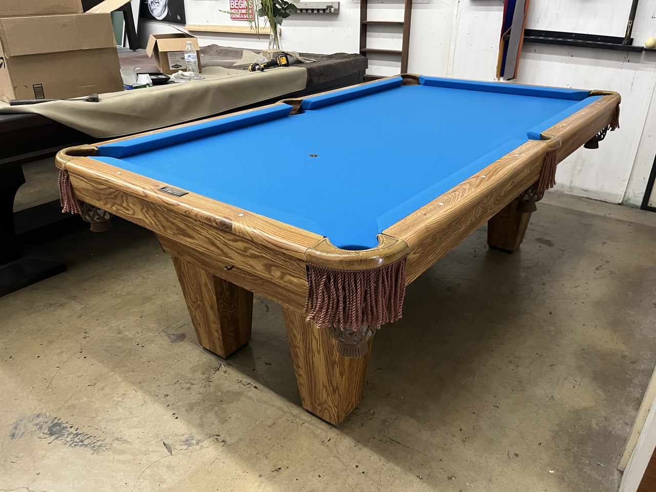 All of our pre-owned pool tables go through an intensive inspection process when they first arrive. We start from the leg casters, to the legs, frame, slate, rails, pockets, cushions and felt. The pool tables are cleaned up, some are sanded and re-stained, frame parts are repaired or replaced if need be. The slates are inspected for any cracks or breaks and are repaired according to their condition. Cushions are always tested for true accurate bounce and are replaced if needed. Leather or plastic pockets are also repaired or re-placed depending on their condition. The cloth is replaced on about 80% of the tables that come though our shop as well. All of our Used pool tables also include: Local delivery ( Millage fees apply on out of town deliveries), Professional Installation (stairs fees apply if any), All Accessories (Balls, Cues, Felt Brush, Matching Color Chalk, Bridge and Wall Mount Rack), and New Cloth by Championship.