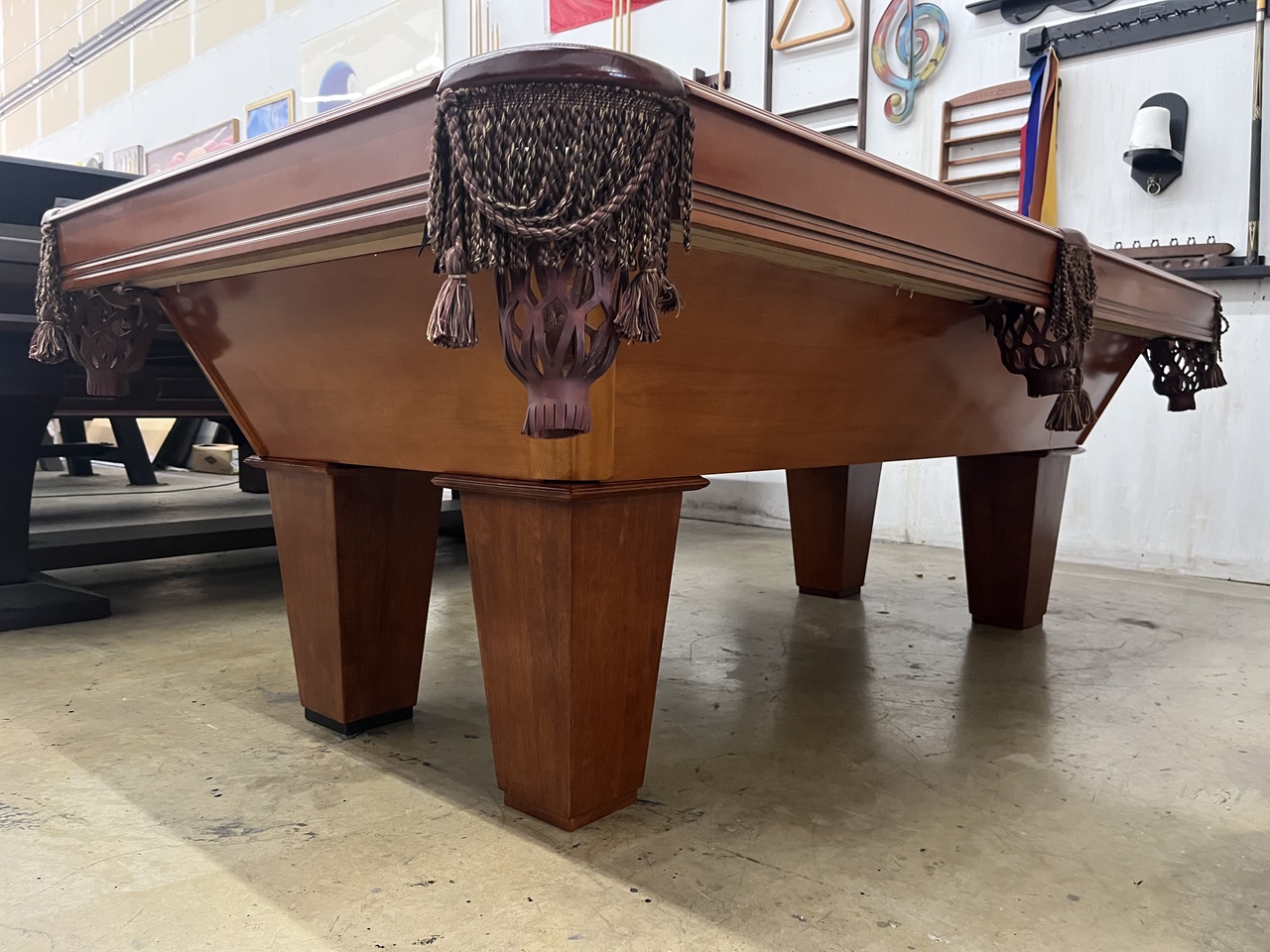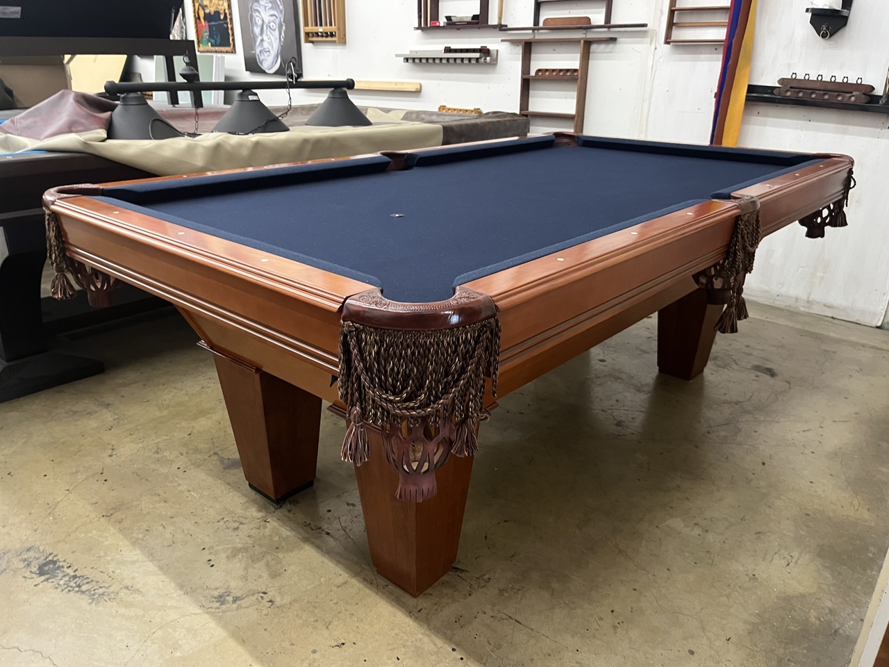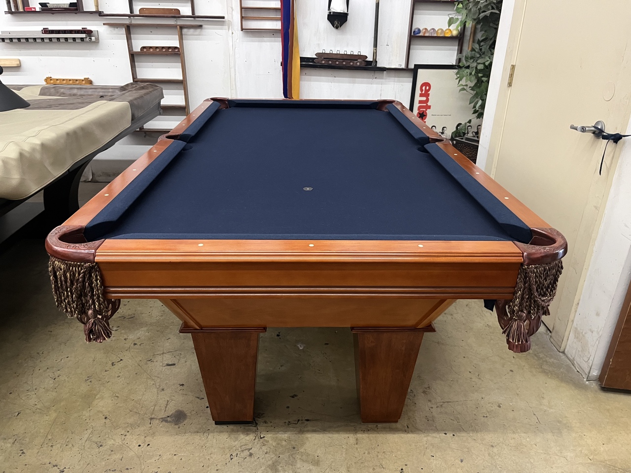 All of our pre-owned pool tables go through an intensive inspection process when they first arrive. We start from the leg casters, to the legs, frame, slate, rails, pockets, cushions and felt. The pool tables are cleaned up, some are sanded and re-stained, frame parts are repaired or replaced if need be. The slates are inspected for any cracks or breaks and are repaired according to their condition. Cushions are always tested for true accurate bounce and are replaced if needed. Leather or plastic pockets are also repaired or re-placed depending on their condition. The cloth is replaced on about 80% of the tables that come though our shop as well. All of our Used pool tables also include: Local delivery ( Millage fees apply on out of town deliveries), Professional Installation (stairs fees apply if any), All Accessories (Balls, Cues, Felt Brush, Matching Color Chalk, Bridge and Wall Mount Rack), and New Cloth by Championship.