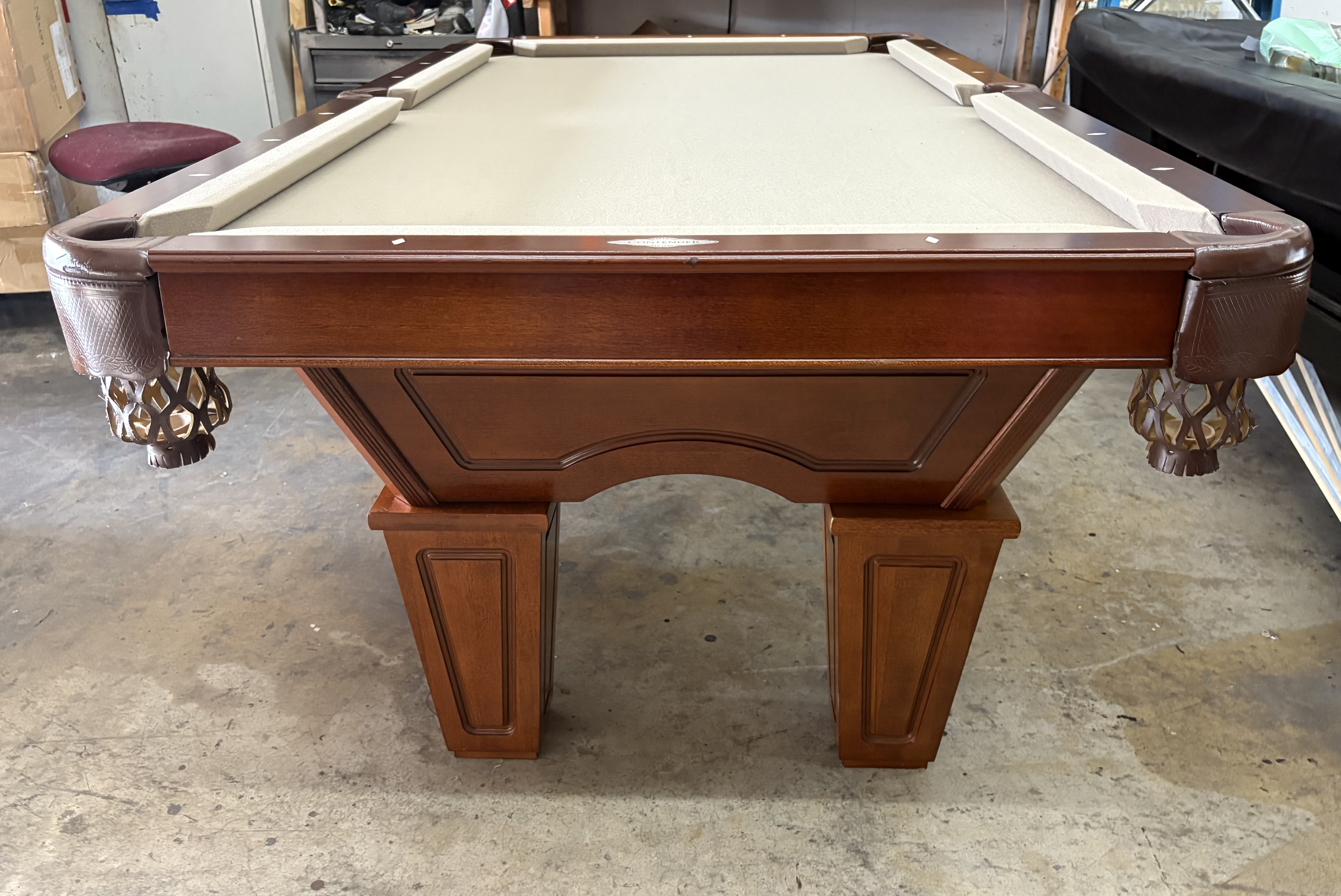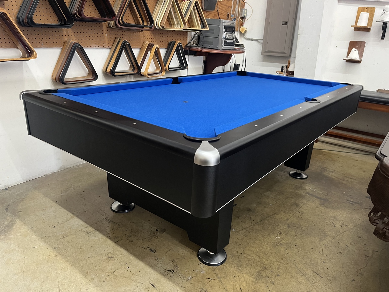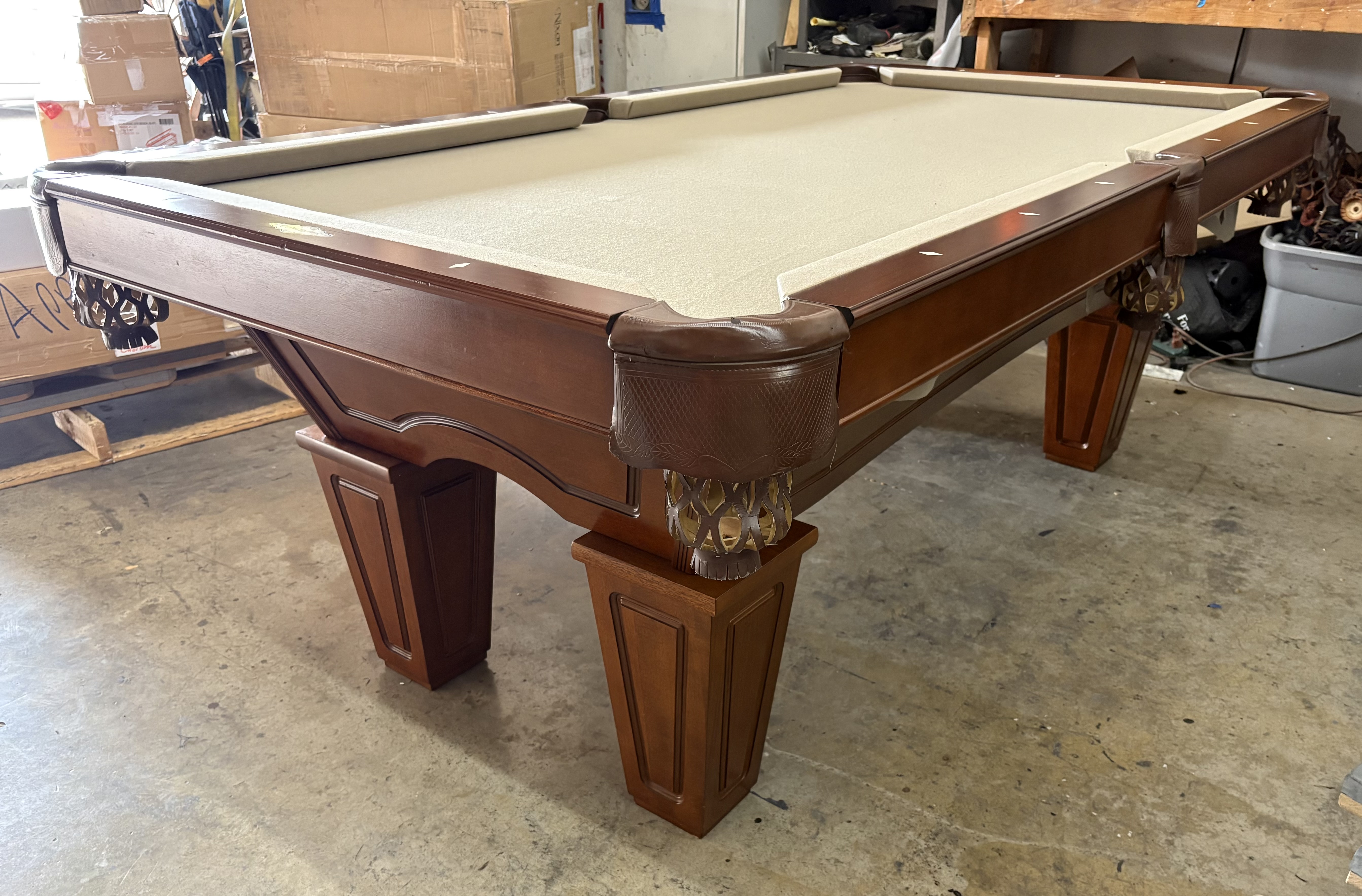 All of our pre-owned pool tables go through an intensive inspection process when they first arrive. We start from the leg casters, to the legs, frame, slate, rails, pockets, cushions and felt. The pool tables are cleaned up, some are sanded and re-stained, frame parts are repaired or replaced if need be. The slates are inspected for any cracks or breaks and are repaired according to their condition. Cushions are always tested for true accurate bounce and are replaced if needed. Leather or plastic pockets are also repaired or re-placed depending on their condition. The cloth is replaced on about 80% of the tables that come though our shop as well. All of our Used pool tables also include: Local delivery ( Millage fees apply on out of town deliveries), Professional Installation (stairs fees apply if any), All Accessories (Balls, Cues, Felt Brush, Matching Color Chalk, Bridge and Wall Mount Rack), and New Cloth by Championship.