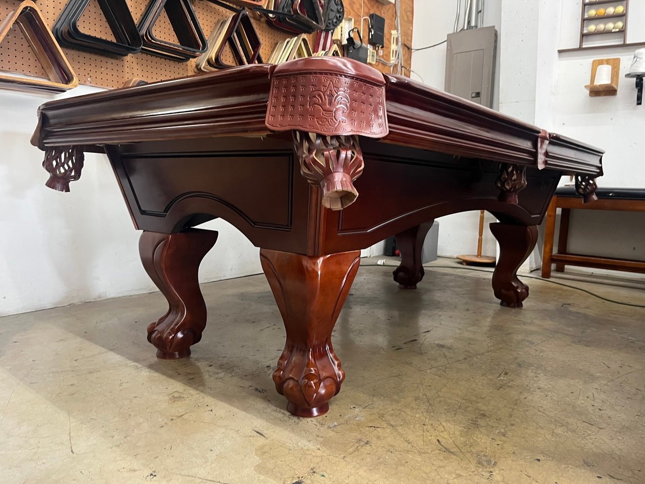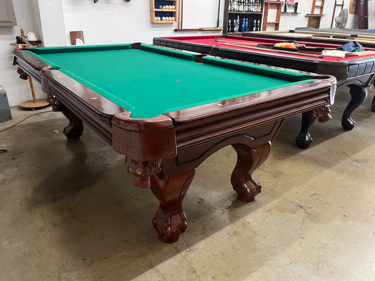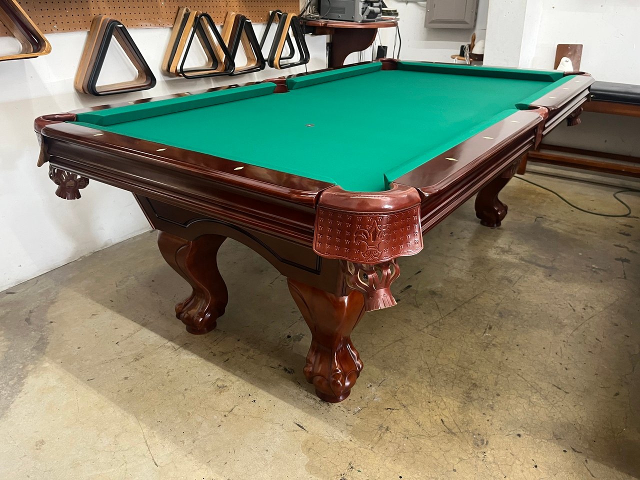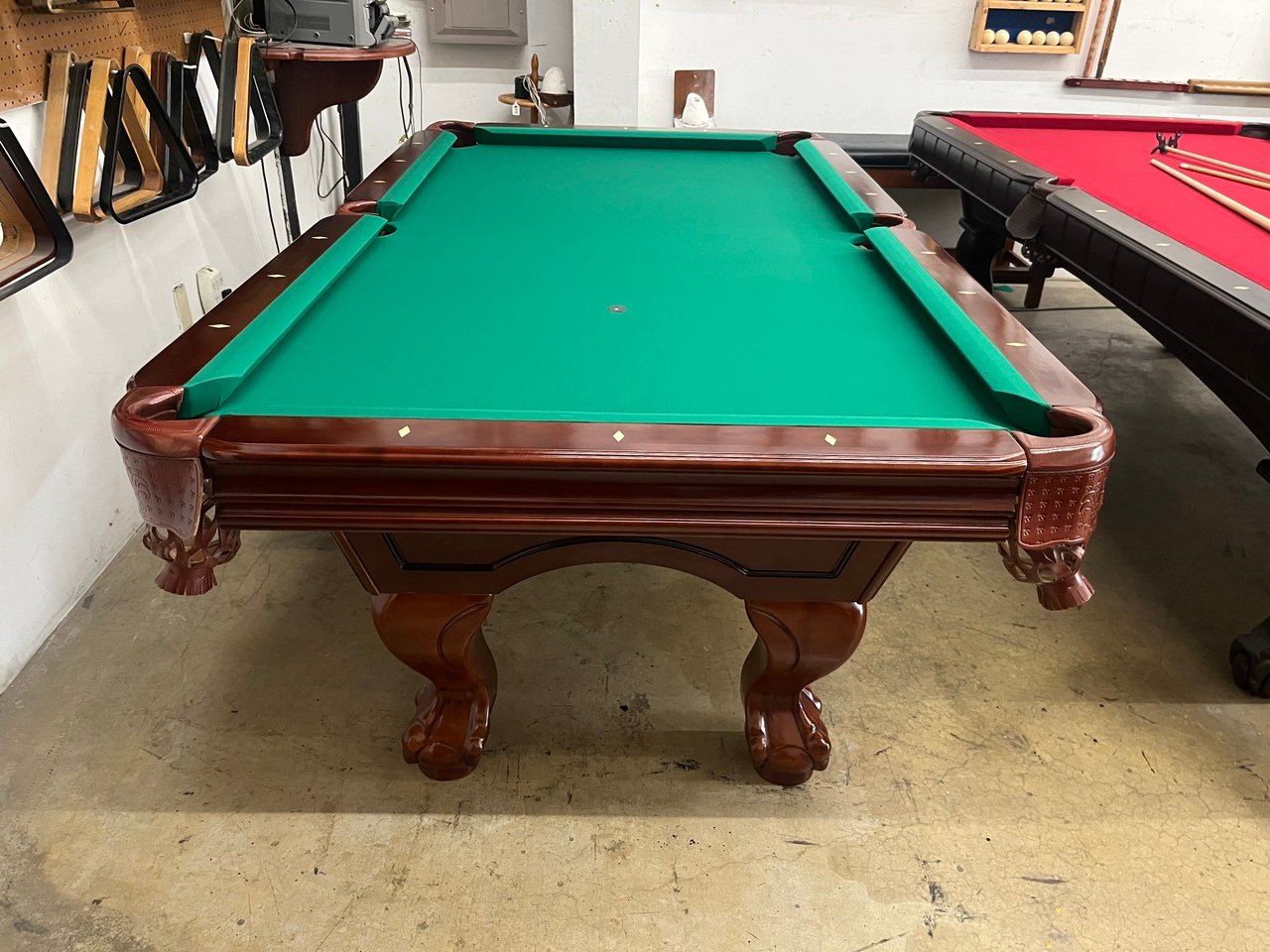 All of our pre-owned pool tables go through an intensive inspection process when they first arrive. We start from the leg casters, to the legs, frame, slate, rails, pockets, cushions and felt. The pool tables are cleaned up, some are sanded and re-stained, frame parts are repaired or replaced if need be. The slates are inspected for any cracks or breaks and are repaired according to their condition. Cushions are always tested for true accurate bounce and are replaced if needed. Leather or plastic pockets are also repaired or re-placed depending on their condition. The cloth is replaced on about 80% of the tables that come though our shop as well. All of our Used pool tables also include: Local delivery ( Millage fees apply on out of town deliveries), Professional Installation (stairs fees apply if any), All Accessories (Balls, Cues, Felt Brush, Matching Color Chalk, Bridge and Wall Mount Rack), and New Cloth by Championship.